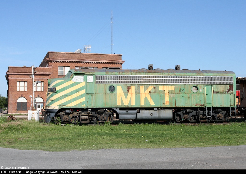 Resting in peace we have the last active MKT F engine before the UP merger now on display with the MKT Denison depot in the background now a railroad museum.