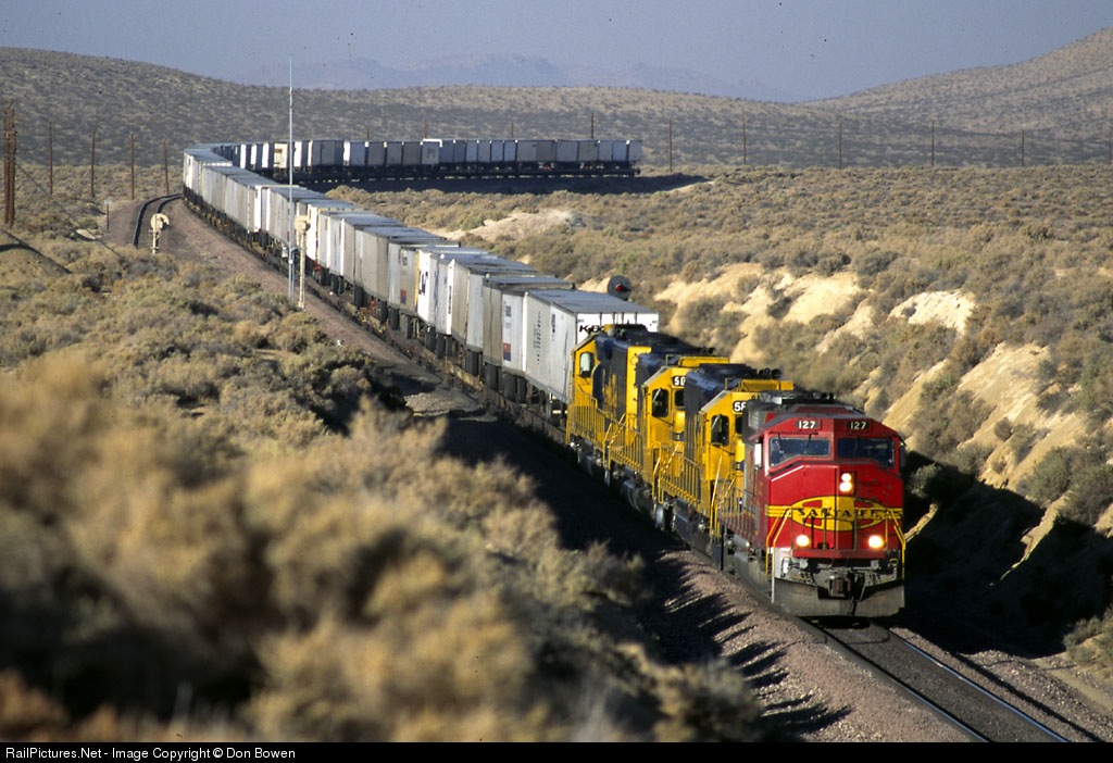 GP 60M 127 leads an expedited TOFC train east in the Mojave Desert of So. California in the fall of 1996