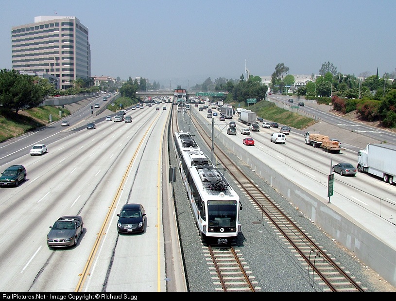 A northbound Gold Line trains is running literally in the footprints of the former Santa Fe Pasadena Subdivision, between Lake and Wilson Avenues in between the lanes of the 210 freeway.