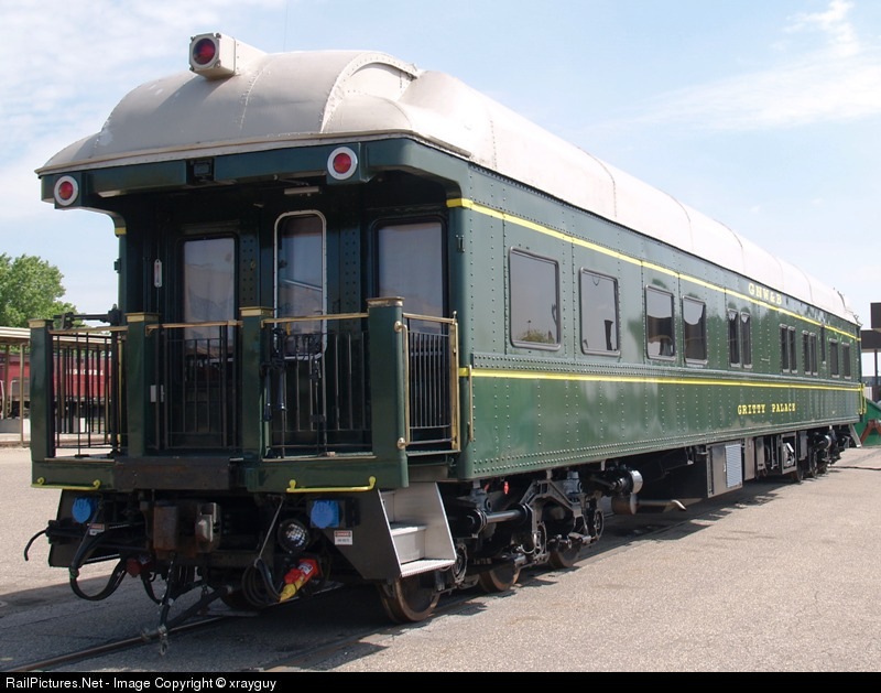 Gritty Palace is ex-Rock Island office car #98, built by the Pullman company in 1912. It was owned by a member of the METRA board in Chicago and re painted to what you see today. GNW&B stands for Going No Where & Back. Info courtesy of Milwaukeeroad Matt