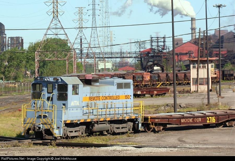 | Empty flats are shuttled back to be reloaded with fresh ingots. Mittal Steel 150 is a Peoria Locomotive Works locomotive rebuild with a Catapillar 3512 prime mover, one of several rebuilt for Inland-Ispat Steel in the early 1990s. |