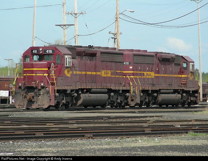 DMIR 418 and 416 sit together, the only two SD45-2 rebuilds on the system