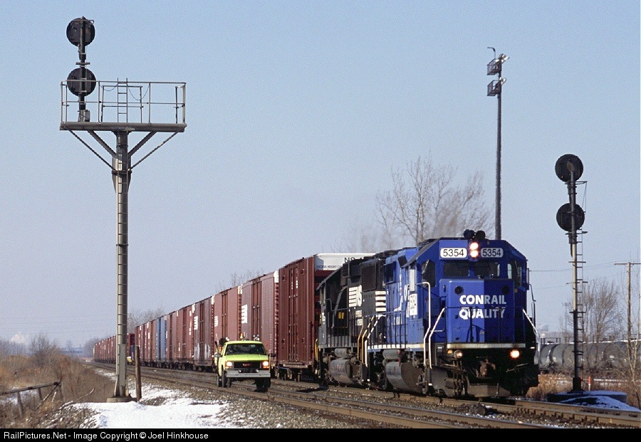 Still in Conrail (Operation Lifesaver) paint, but with the "PRR" patch identifying this as a NS locomotive, 5354 rolls past a hi-railer in Gary, IN.