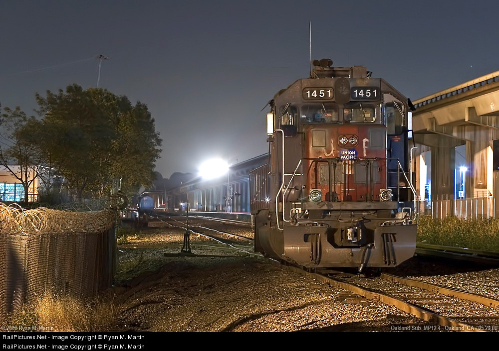 | Thanks to a small derailment off the Oakland Sub industrial lead (seen in the background), the patched UP 1451 (ex-SP7676) ended up stranded in East Oakland for two whole nights. Of course spending just one night in East OakTown is rough enough. A Richmond-bound BART train can be seen on approach on the elevated ROW. |