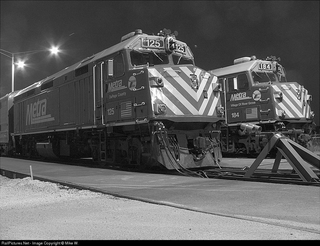 | METX 125 and 184 sit in Manhattan awaiting tommorow's commuter rush. Metra service was only recently expanded to Manhattan, with two trains running to Chicago and back. |