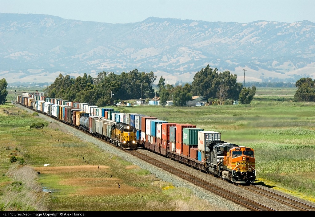 | Talk about good timing! The UP local MRVSJ meets the DPU of an EB BNSF stacktrain, BNSF H2 GEVO 7672 and an NS SD70M-2 2726. Here is the view if I did a complete 180 degree turn: http://railpictures.net/viewphoto.php?id=141256 |