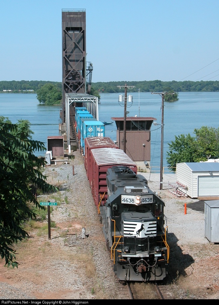| A81 rolls off the Tennessee River drawbridge; on the other side of the river, CSX M781 can be seen to the left of the bridge and NS 737 can barely be seen to the right (look for the orange BNSF power between the trees) as they wait to cross the bridge. |