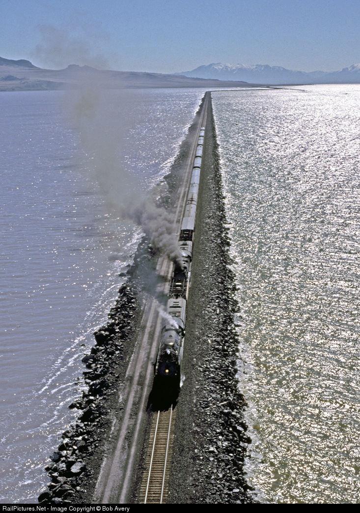844 and 3985 cross the Great Salt Lake by means of the former SP Lucin Cut Off, en route from Cheyenne to the Sacramento Railfair.