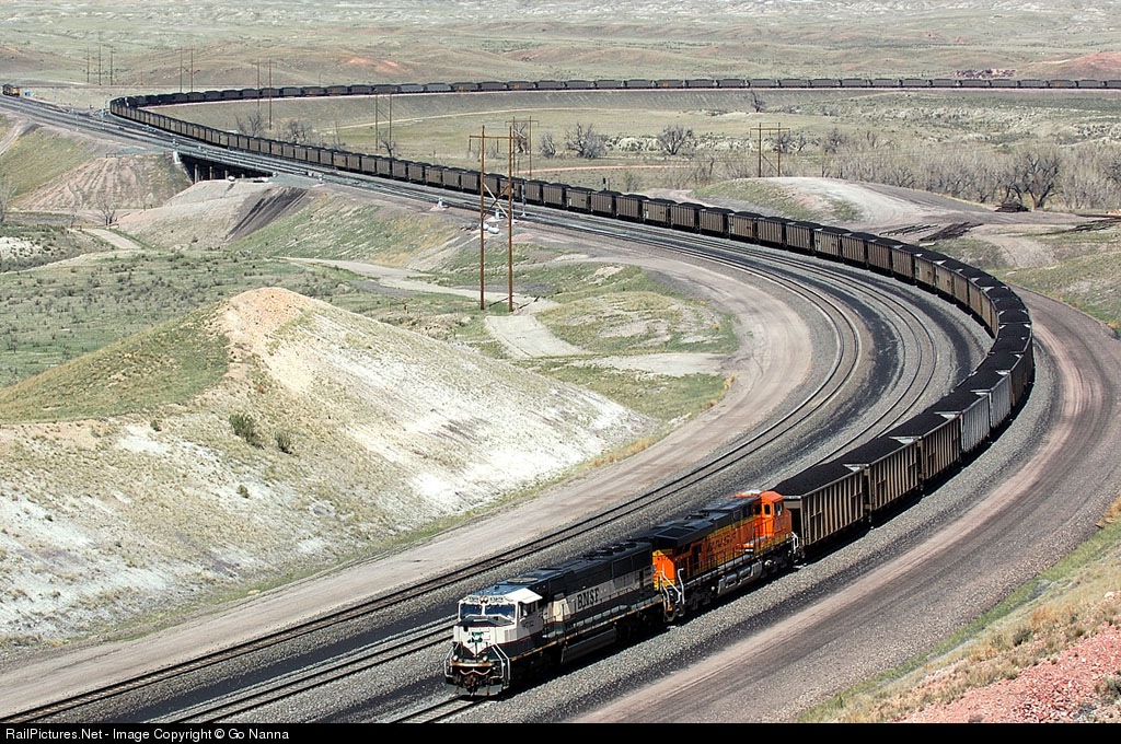 | A BN fashon SD70MAC 9732 collaborates with ES44AC 5772 to take full coal from North Antelope mine, making a big-S at Naaco Jct. |