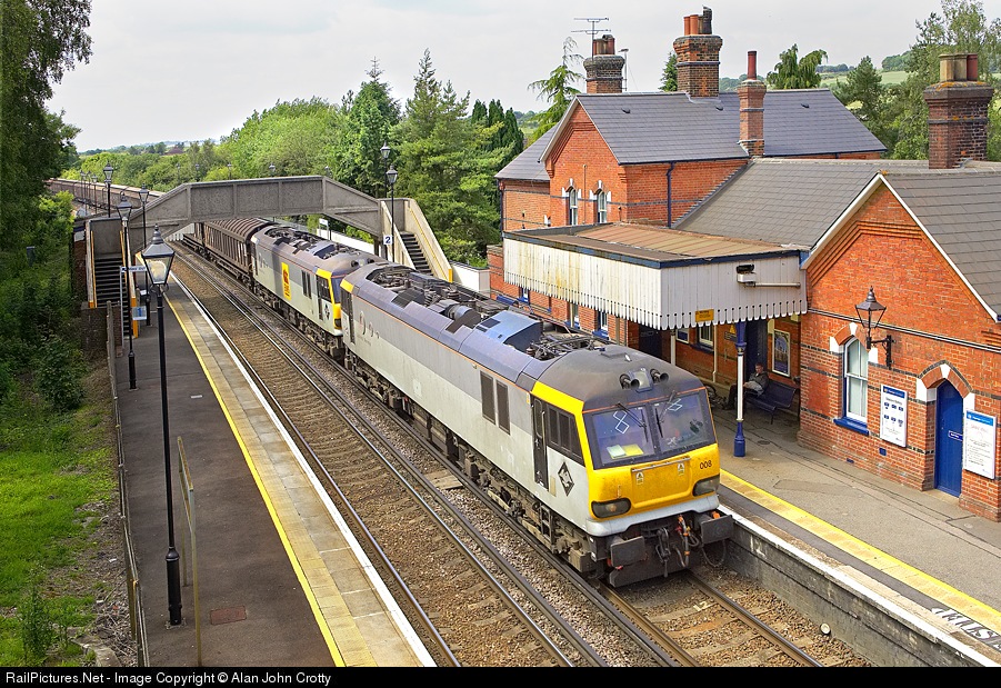 | This is not what it seems, 92s draw too much current to run in multiple on the third rail system. the second loco, 92027 is dead in tow. The train is a Channel Tunnel Freight. |