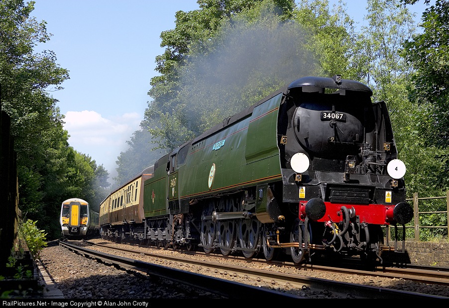 | That was a close run thing, I set up for the steamer, when out of my right ear I could hear an electric train approaching, closing speed about 150 mph! As you can see, it just cleared in time! 34067 is making 75mph hauling the Orient Express. |