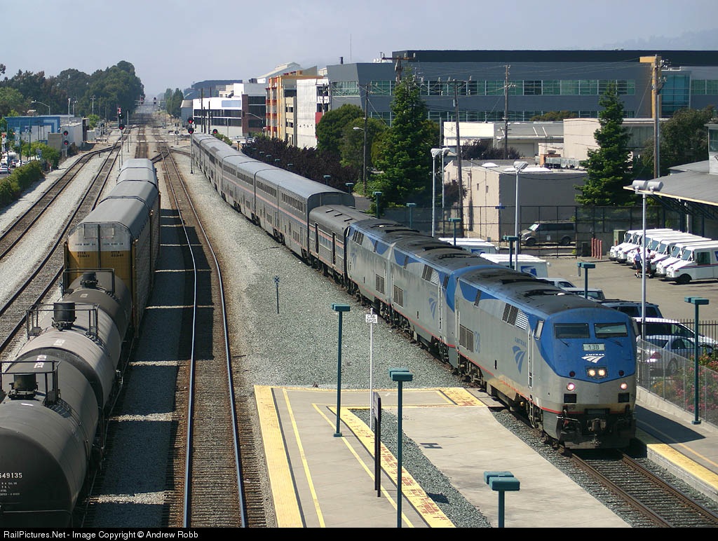 | an EXTREMELY late, Starlight arrives into Emeryville station as the Warm Springs local waits for it to clear the crossover |