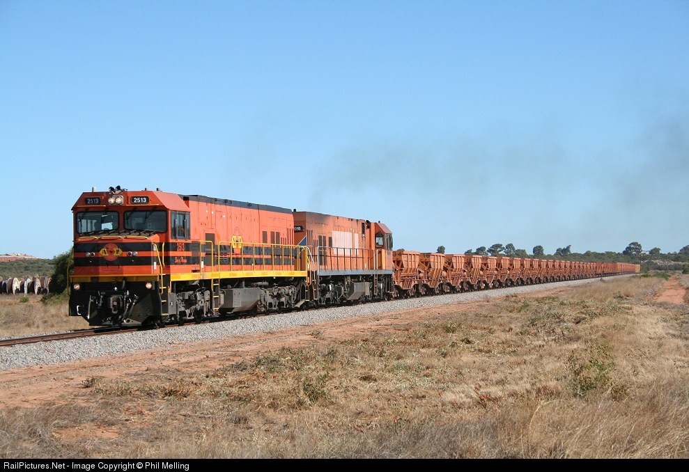 | 2513/P2016 combine to haul an empty iron ore train to Mullewa. 2513 carries Genesee & Wyoming family colours but this in time will change with the takeover by Queensland Rail of the Australian Railroad Group. |