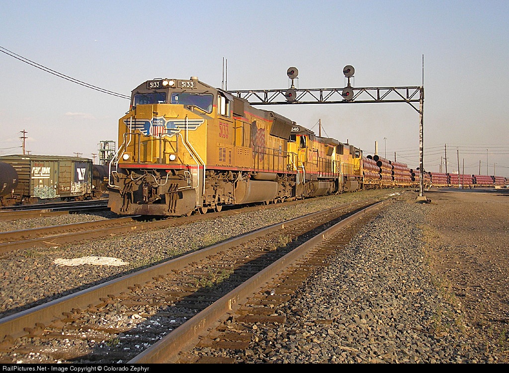 | Third wb unit pipe train originating in Alabama headed to Empire Siding near Craig, CO, for EnCana natural gas line project. UP 5133 & B40-8 1846 added to UP SD70M 4486 at UP's North Yard. |