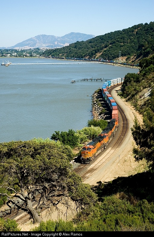 | BNSF takes advantage of its trackage rights on UP's Cal-P (Sacramento-Oakland) line. Here we see BNSF H2 GEVO 7706 leading a WB OIG (Oakland Intermodal Gateway) bound stack train along the San Pablo Bay. Nikon D200, 18-70mm. www.bayarearailroading.com. |