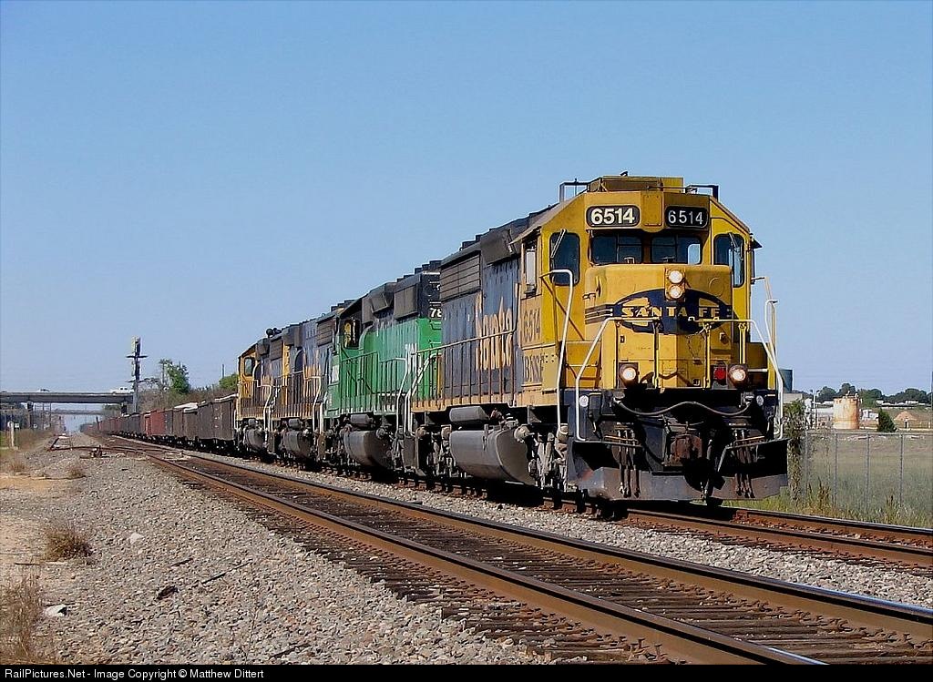 Southbound loaded rock train accelerates in the siding at Sealy as it departs for Pearland. Note that another SD45-2u and a SD45-2Bu have been assigned to this train to help SD45-2u 6514.