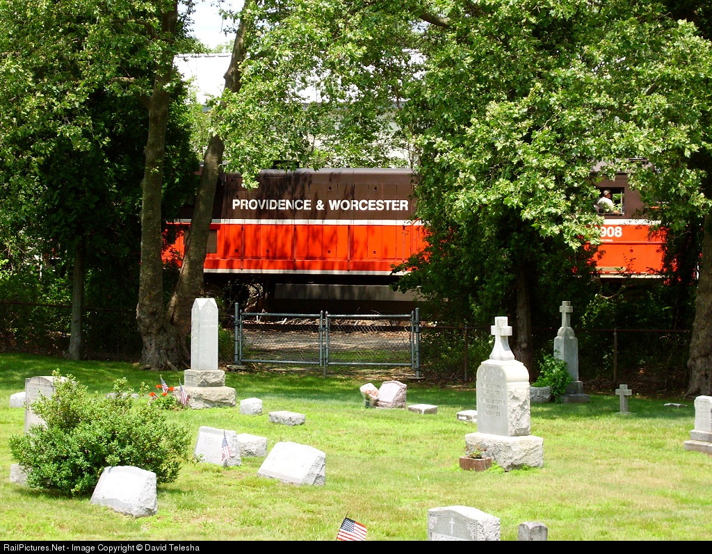 Across the grave yard and through the trees, you can see the engineer of Providence & Worcester 3908 look ahead as he comes off the wye.