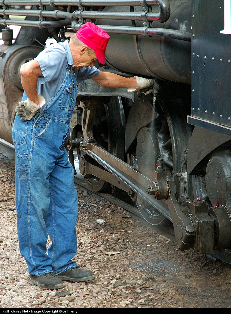 Engineer Jerry Drager drains the air tank on No. 104 prior to the first run of the day.