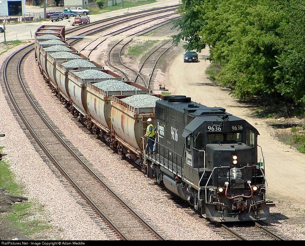 | IC 9636 leads a CN ballast train under the Hwy 26 overpass. One of the section guys can be seen hanging on to the engine. They will start laying ballast in about 1/4 mile when they reach East Jct. The section guys had to walk along this train for 5 miles. |