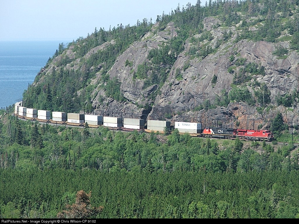 | CP #108-CP 8704, CN 2541, 93 intermodal platforms-360 axles @ 11:28 turns away from Lake Superior to cross the Little Pic River and begin the climb of Neys Hill. |