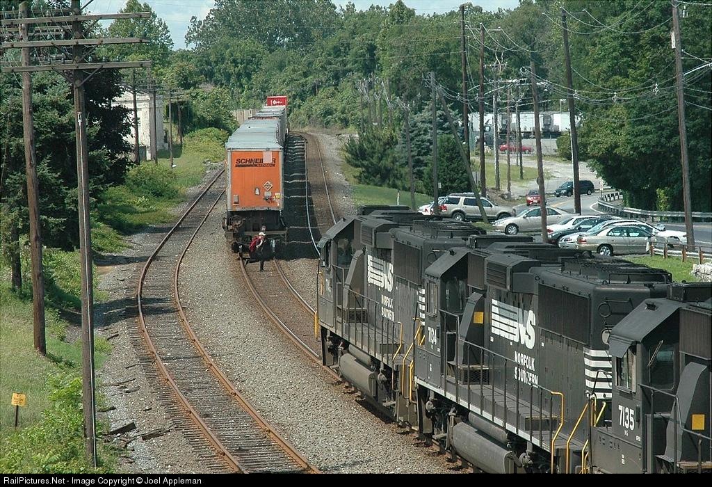 A trespasser crosses the tracks between NS trains 21Q and 211 lead by NS 7142. Both trains were traveling west on track 2 at 10 mph due to the July 5 derailment.