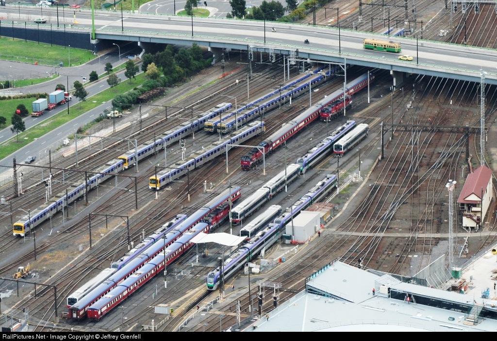 Passing stabled trains at Southern Cross Station, the old signal box can be seen on the right hand side.