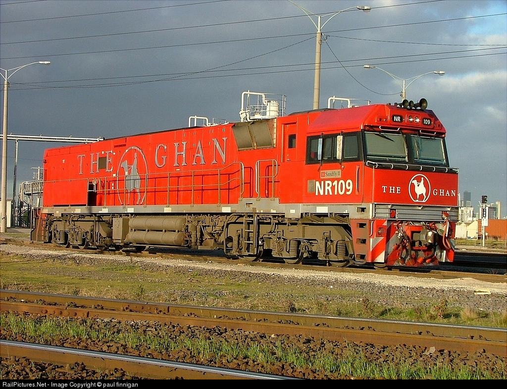 NR109 in THE GHAN livery enjoys the late afternoon sunshine as it waits its next turn of duty at Dynon.