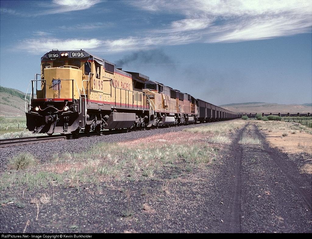 | A sign of things to come was evident in 1994 as a trio of UP units - 9195, 6184 and 6043 - heads up a coal train at Scofield, UT on June 23, 1994. |