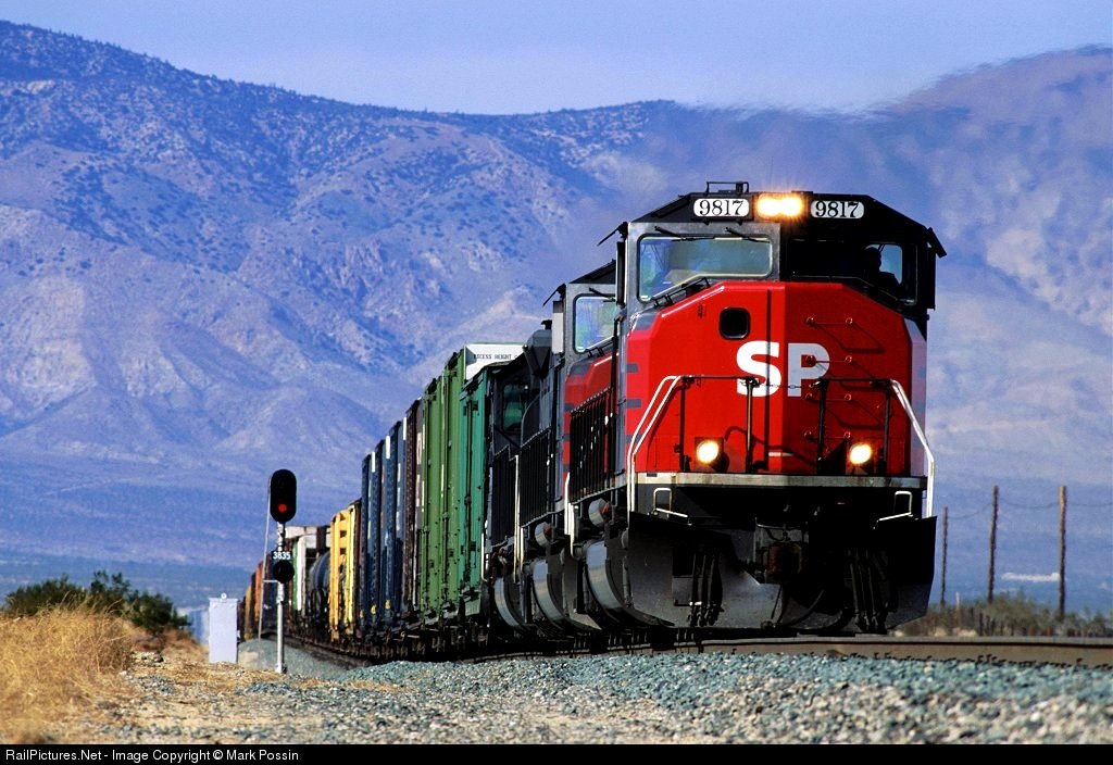 Carrying the SP scarlet and gray in regal fashion, the SP 9817 East roars upgrade out of Mojave.