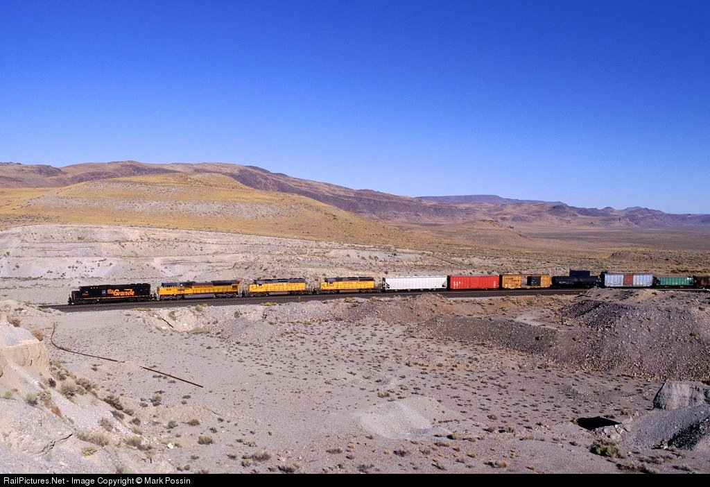 | This westbound merchandise train, seen at Sand Pass in western Nevada, sports an SD50/SD9043/SD40-2/SD40-2 lashup. |