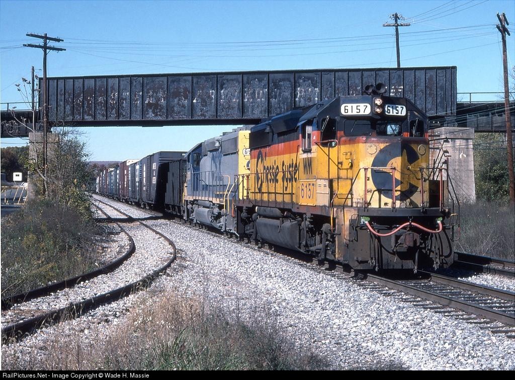 | The Western Maryland Railway no longer exists, but two traces of it can be seen in this photo. Faded Western Maryland lettering remains on the bridge, and the 6157 still proudly wears her WM initials on the cab. |