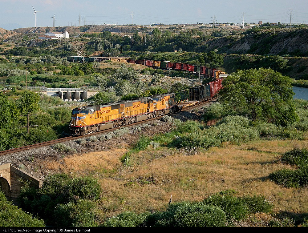 A trio of UP SD70M's tackle a long 40 mph curve in the Jordan River Narrows.