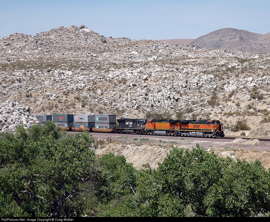 | Westbound BNSF train S-KCKSCO1-13 passes through the rocky scenery just north of Victorville, CA. The power is BNSF 1003, BNSF 4195 and NS 2642. |