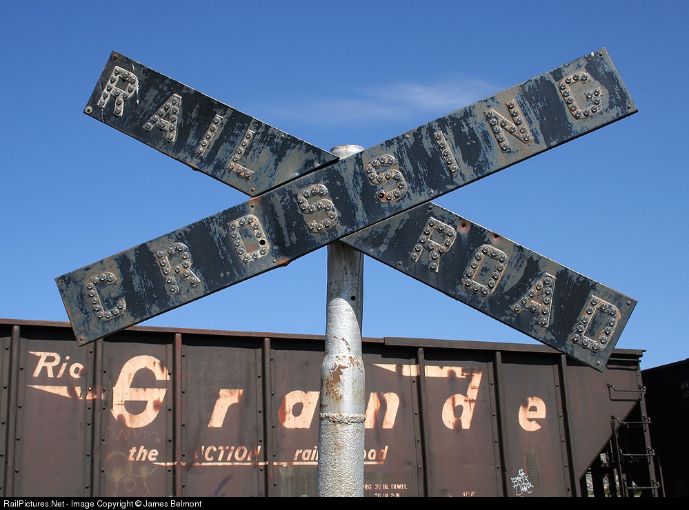 A Utah Railway coal empty crosses Consumers Road at Wildcat siding. This antique crossbuck, with tiny reflectors, dates to the steam age on the Utah Railway Company.