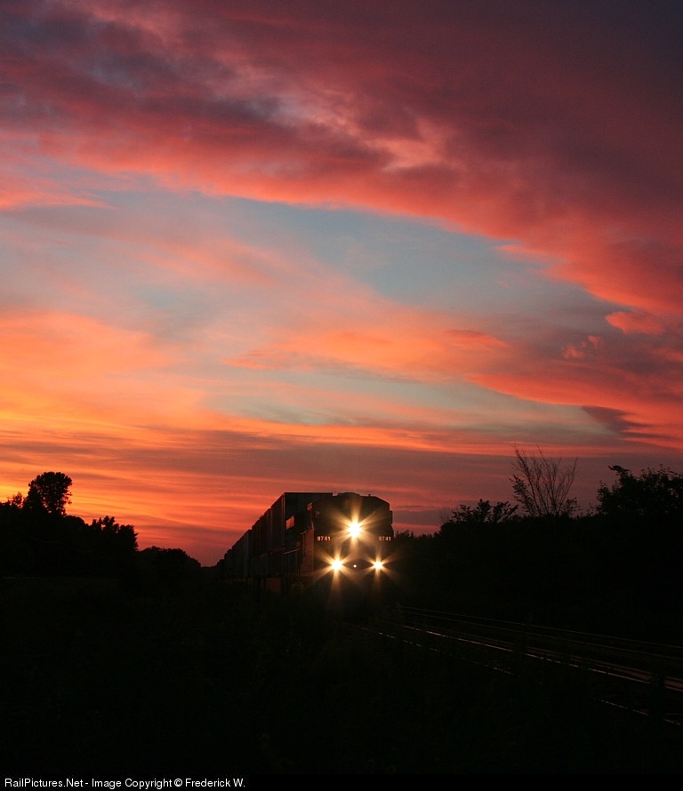 A relatively new GEVO slows to a stop under a fiery sunset. This train was a short one, at 3200ft.