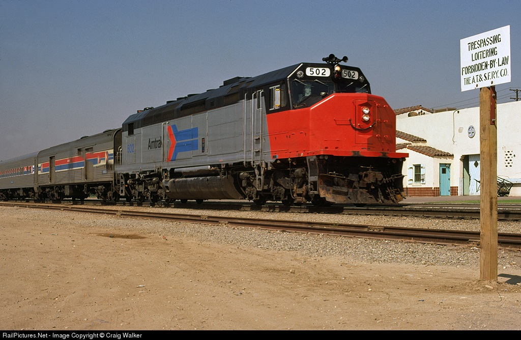 An Amtrak "San Diegan," in the charge of SDP40F 502, makes a station stop at Fullerton, California, before heading on to San Diego, on September 23, 1974. Fullerton's station looks quite a bit different now!