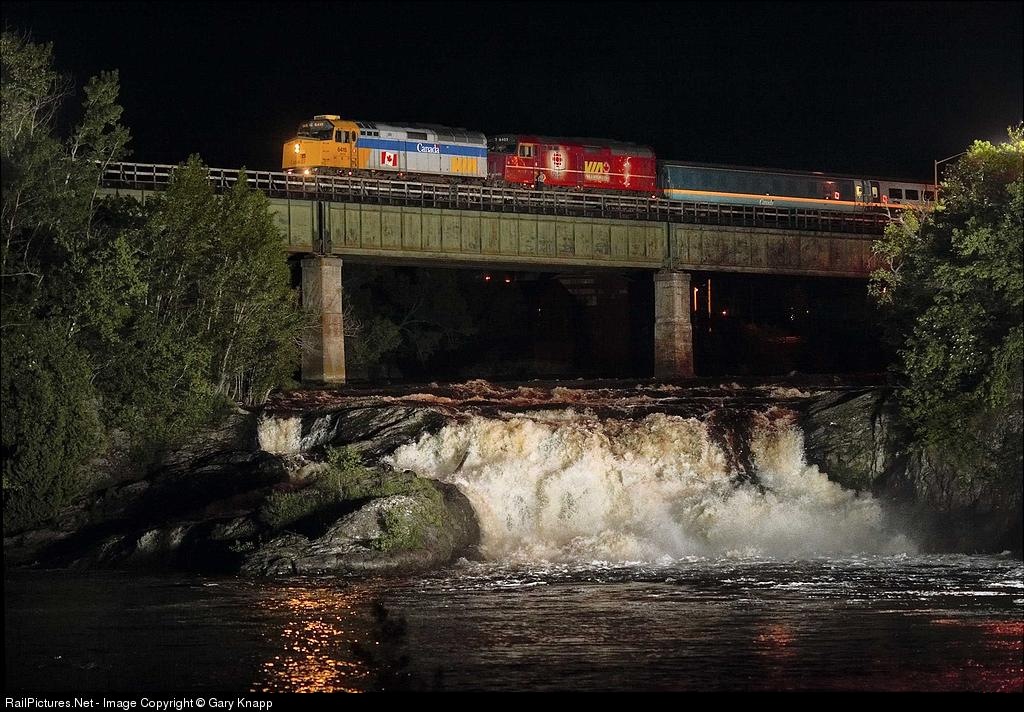 VIA 14 drifts across the Upper Falls of Riviere-Du-Loup as it makes its station stop in the rivers namesake city at 00:34