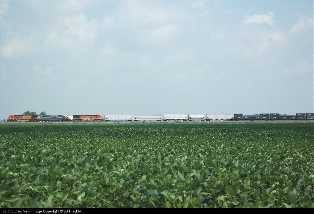| CSX L383 having problems at East Hamler with a BNSF C44-9W, a CSX SD50, and another BNSF C44-9W. |