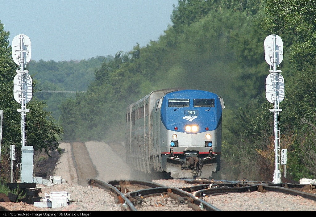 RailPictures.Net Photo: AMTK 180 Amtrak GE P42DC at Prescott, Iowa by Donald J Hagen