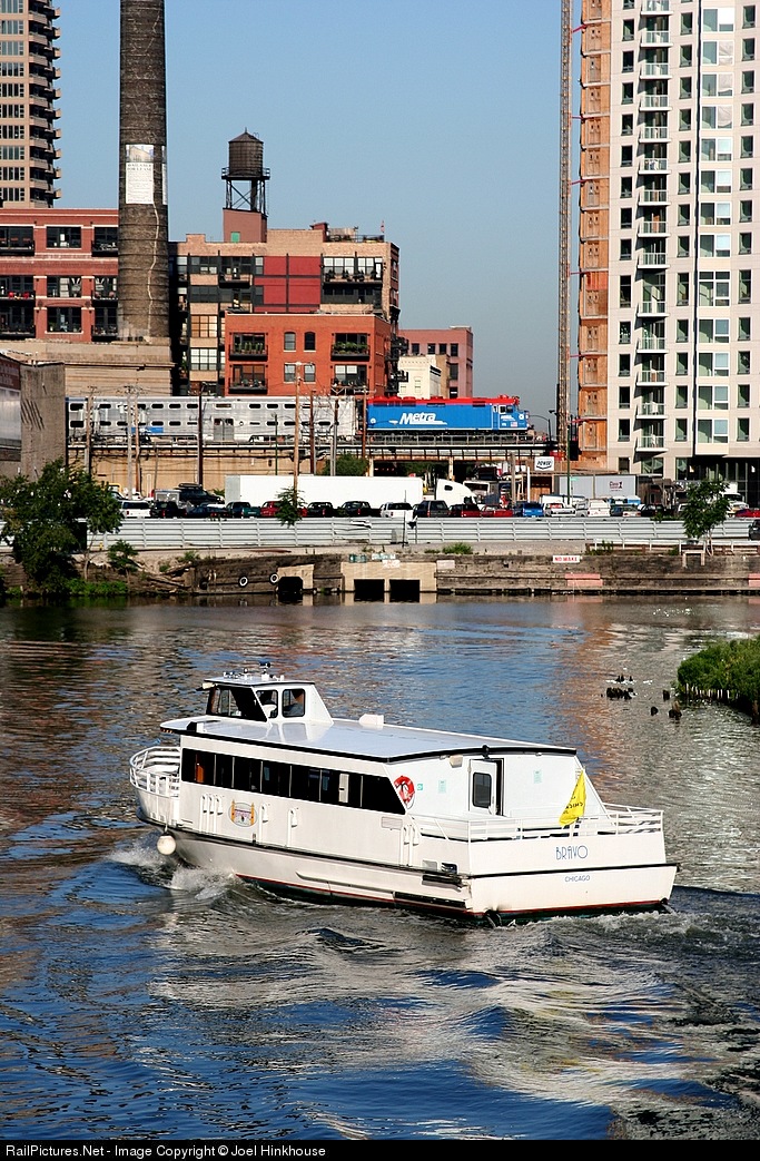 As another in the daily parade of Metra trains backs into Ogilvie Center, a Wendella Riverbus rounds the bend. Some of those Metra passengers will likely take this Riverbus.