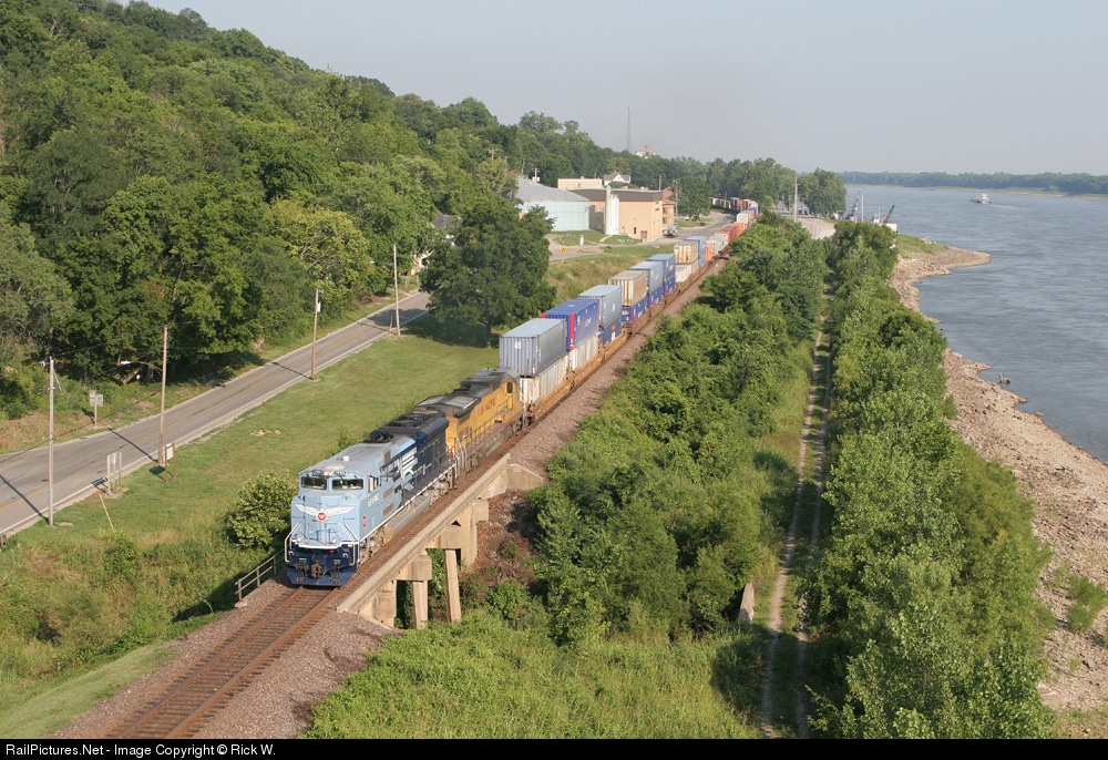 The Mo-Pac Heritage unit leads it's train northbound along the Mississippi River through Chester, IL, as it's competition pushes some barges south on the river.