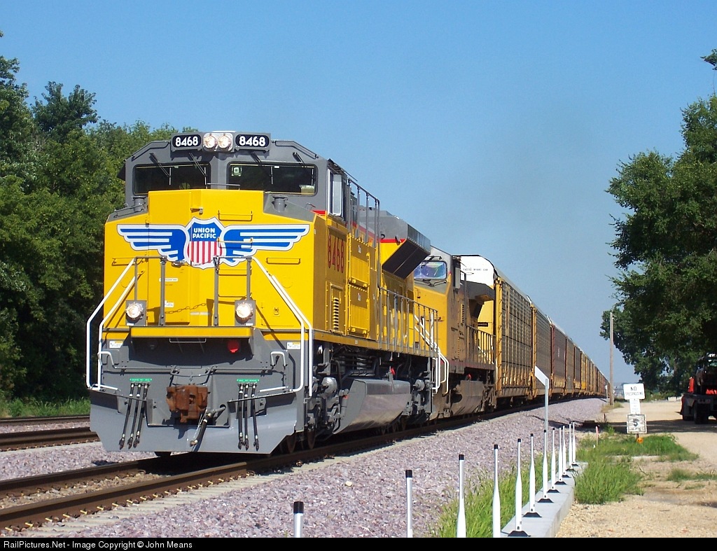 | UP 8468 heads up an auto train through LaFox. They obviously wanted to keep this train moving, because freight doesn't usually use the new Main 3 between Peck and Elburn. He was crossed at Peck to get past Metra. |
