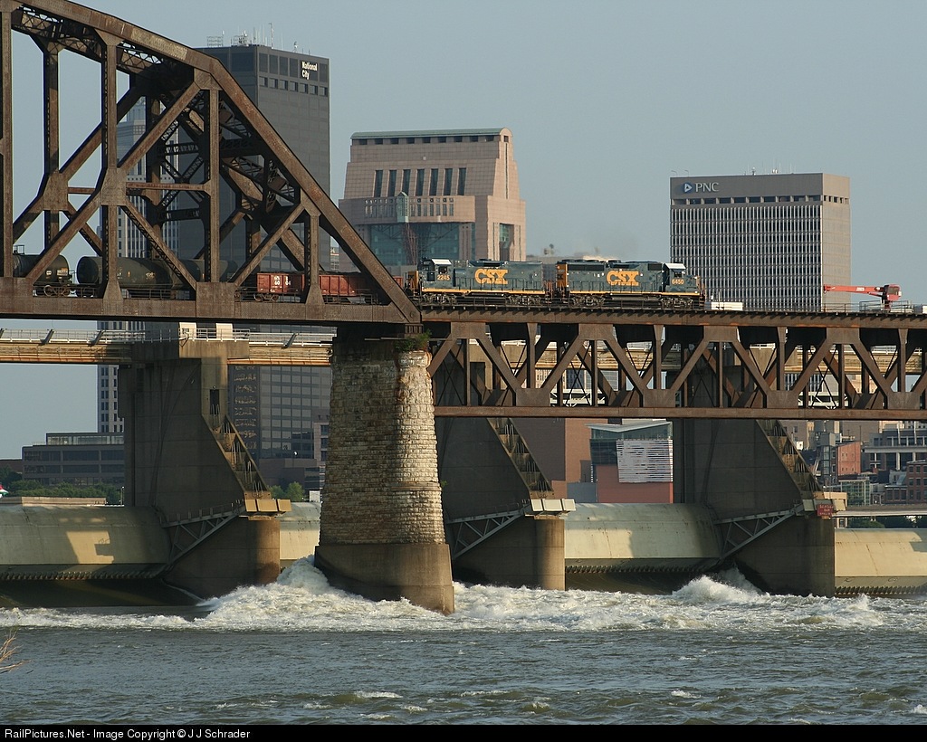 CSXT southbound drag manifest/local crosses the Ohio river from Jeffersonville, IN to Louisville, KY. Louisville city line is visible in the background.