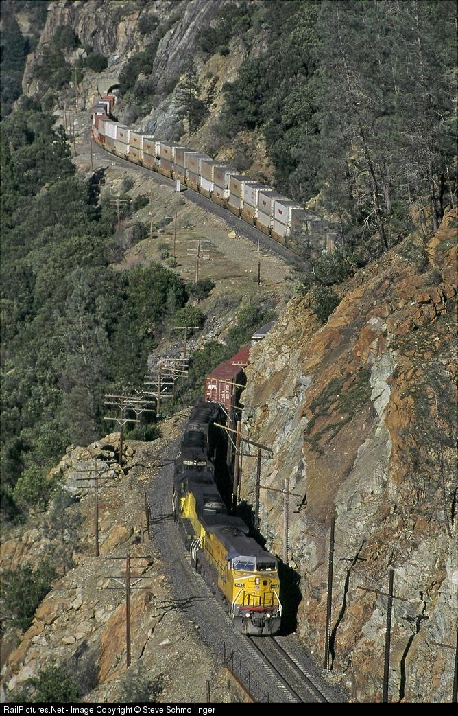 | A westbound APL stack train from Chicago threads tunnel 10 along the granite ledge of the lower canyon and approaches tunnel 9, which pierces the flanks of Hungry Hunt Peak. |