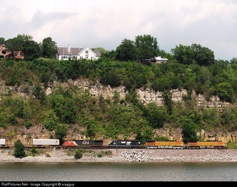 Three railroads represented on this Z train. BNSF, NS and CN cruise eastbound along the Mississippi.