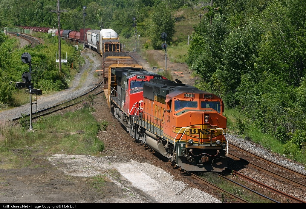 CN 394 rolls off the Dundas sub with BNSF 134 leading CN 2594.