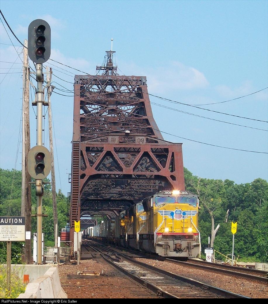 UP 3806 leads a westbound over the Mississippi and into Iowa.