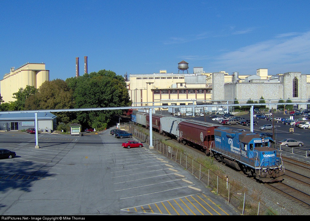| The Hershey Shifter on its way to switch cars out at the Reese's Factory. The Hershey Chocolate Factory in the background. View more of my photos at http://mst145.rrpicturearchives.net |
