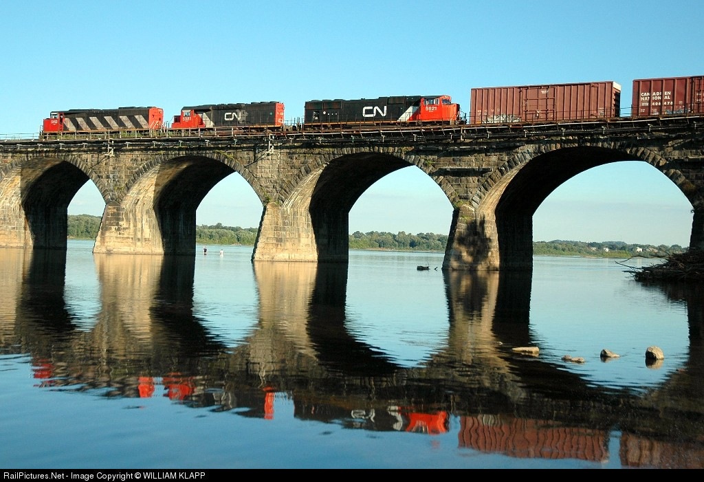 | westbound on Rockville bridge just before sunset with three CN engines on Train. CN 5413, CN 5381, CN 5621,