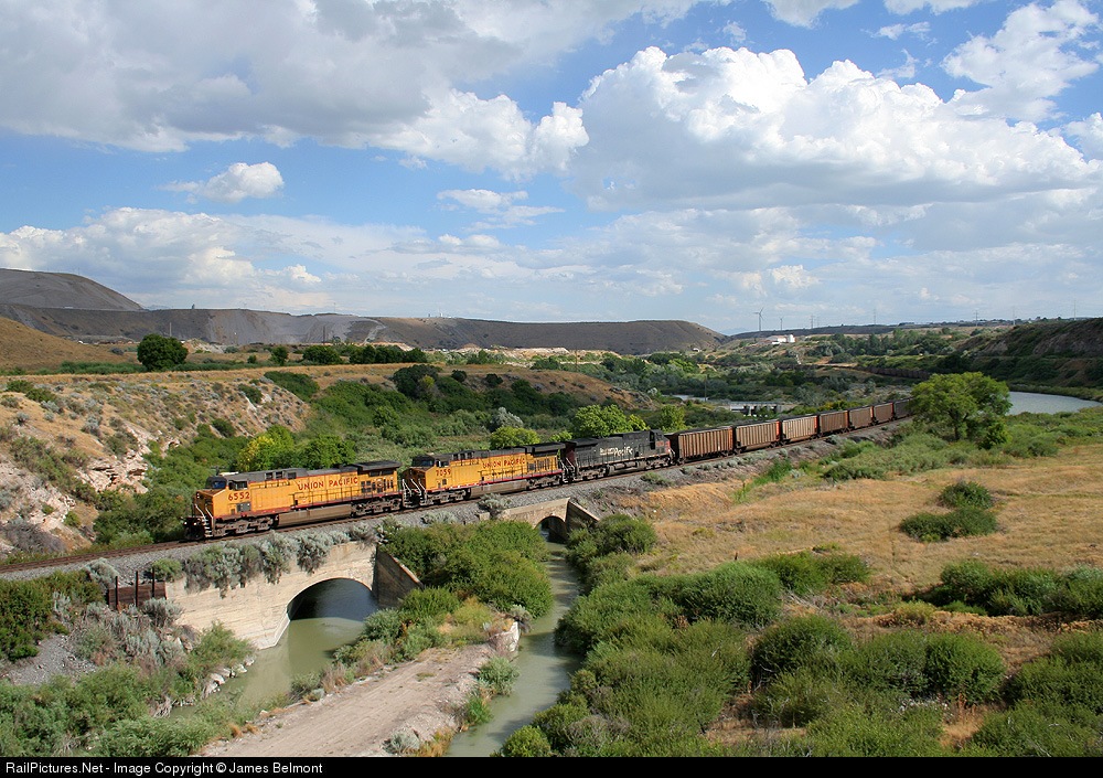 108 coal loads from Carbon County curve west through the Jordan River Narrows approaching East Riverton.
